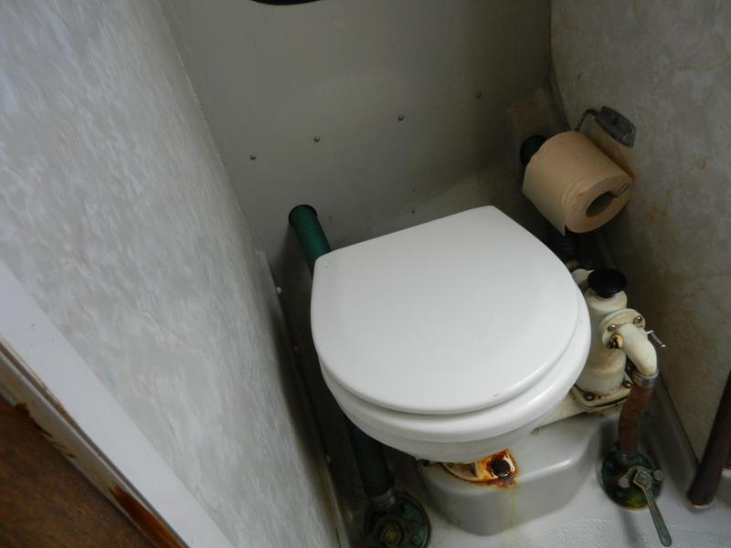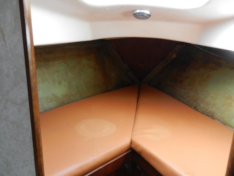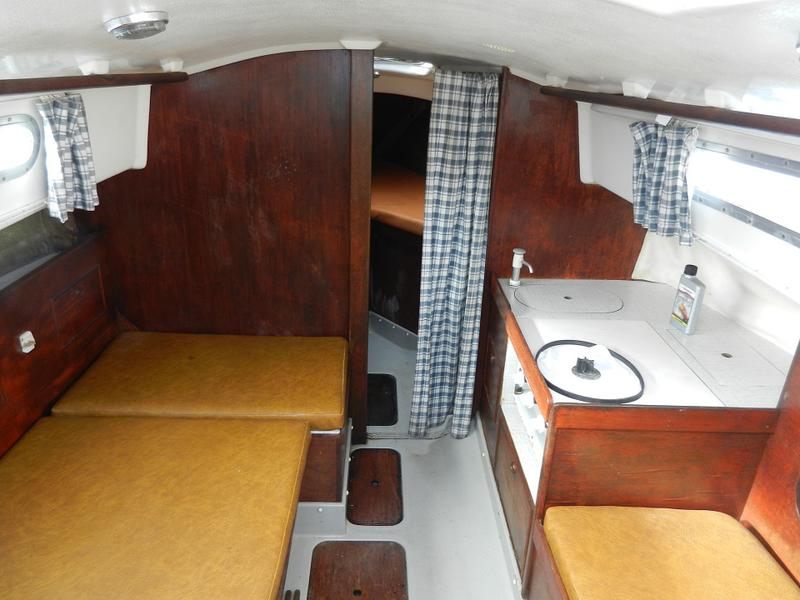 Galley to starboard with a two burner gas cooker with grill (not connected, new piping and regulator required), stainless steel sink and storage lockers,